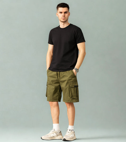 L'MONTE Men's Cotton Casual Army Green Elastic Waist Cargo Shorts